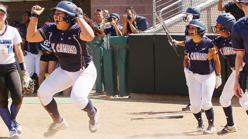 El Camino College Softball celebrates a run, during their 5-4 victory over College of San Mateo. Photo By: Richard Quinton