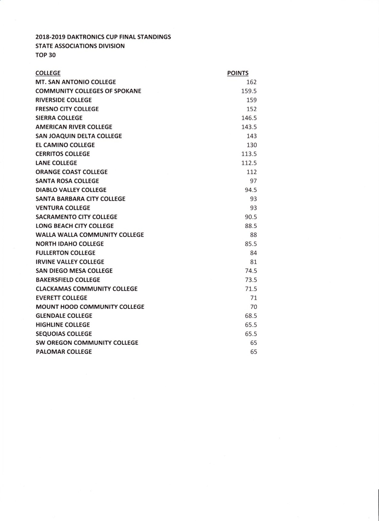 Mt. SAC posted 162 points in the final tally, edging Riverside, which finished with 159 points, and Fresno City, which took third with 152. Sierra College (146.5) led the standings after the midway point of the 2018-19 athletic year and took fourth, followed by American River (143.5), San Joaquin Delta (143.0), El Camino (130.0), Cerritos (113.5) and Orange Coast (112.0).